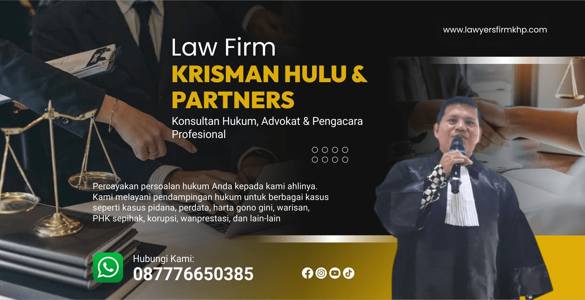 Law Firm KRISMAN HULU & PARTNERS (KHP) adalah firma hukum yang didedikasikan untuk memberikan layanan hukum profesional dan terpercaya. Dengan tim advokat, konsultan hukum, dan pengacara berpengalaman, kami hadir untuk membantu klien dalam menyelesaikan berbagai permasalahan hukum, baik secara litigasi maupun non-litigasi. Kepuasan klien menjadi prioritas utama kami, dengan pendekatan yang strategis, personal, dan solutif.
